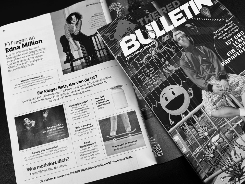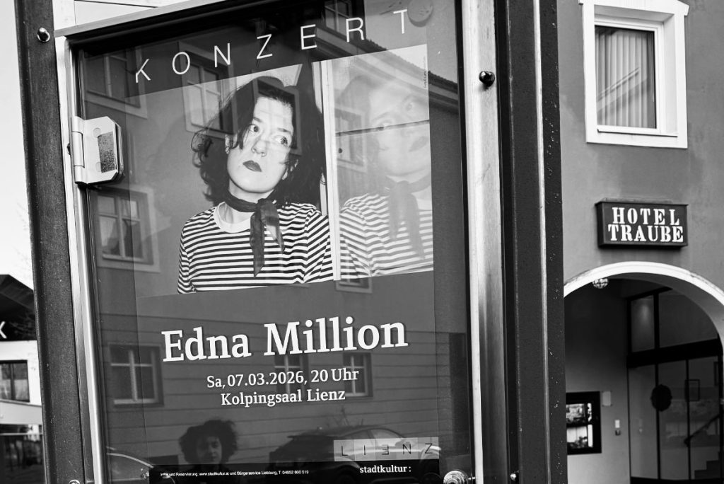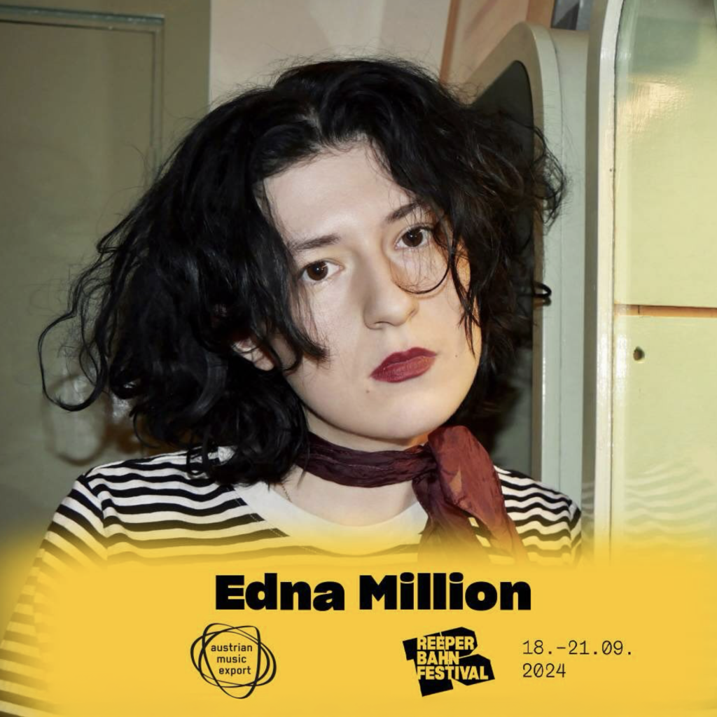Edna Million Live at Popfest Wien 2023Edna Million by Luna CetoEdna Million by Luna CetoEdna Million Stamp by Thomas KussinEdna Million by Luna CetoEdna Million Self PortraitEdna Million by Hannah TögelLinz Hauptbahnhof, Juni 2024StuttgartBreitenseer Lichtspiele, 14. Dezember 2024Porgy & Bess, November 2024